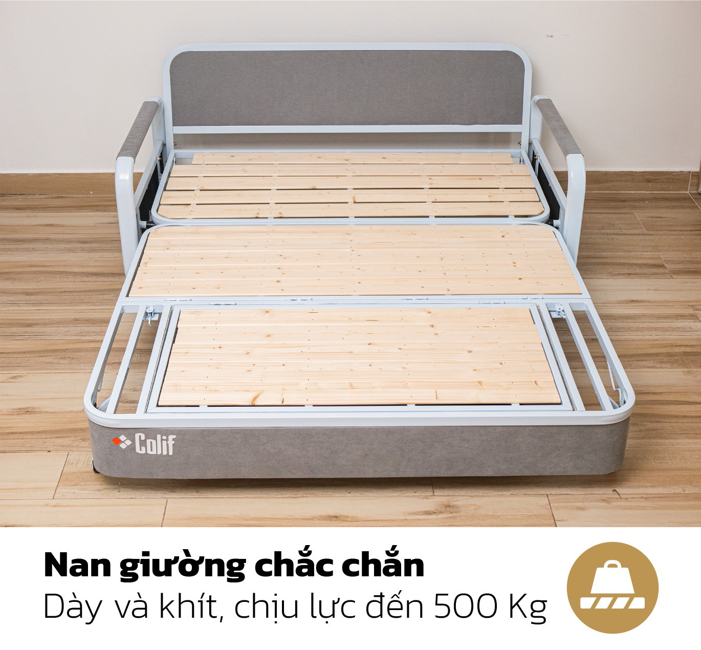 Giường sofa thông minh Colif Smart Bs được thiết kế với các nan giường bằng gỗ thông nguyên khối, mỗi nan có chiều rộng 10cm. Các nan giường được xếp khít lại với nhau, có khả năng chịu lực lên đến 500kg.